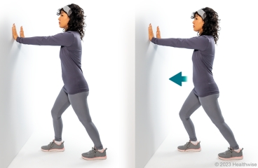 Keeping your back leg straight and your back heel on the floor, bend your front knee and gently bring your hip and chest toward the wall until you feel a stretch in the calf of your back leg.