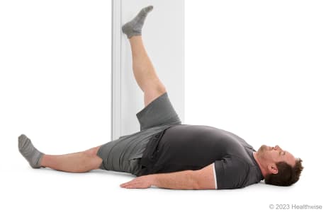 Slide your affected leg up the wall to straighten your knee. Don't point your toes. You should feel a gentle stretch down the back of your leg. Be sure to: