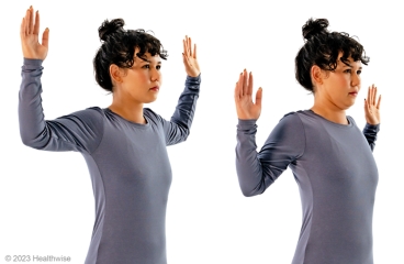 3. Bend your elbows and slowly lower your arms while squeezing your shoulder blades down and back. Keep your elbows back and your hands up throughout the exercise. If you're using a wall, keep your arms and hands against the wall. You will feel your shoulder blades slide down and together. At the same time, you will feel a stretch across your chest and the front of your shoulders.