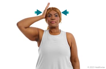 4. As you press against the side of your head with your hand, also press your head back against your hand. You should feel the muscles at the side of your neck tighten, but your head should not move to either side. Press firmly, but not as hard as you can.